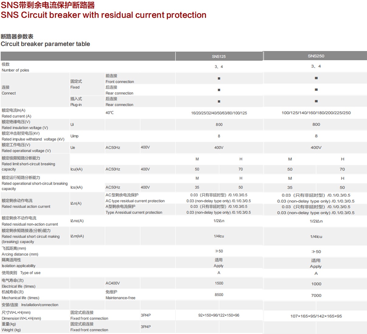 SNS帶剩余電流保護(hù)斷路器可對人提供間接接觸保護(hù),還可以對過流保護(hù)不能檢測的長期存在的接地故障可能引起的火災(zāi)危險(xiǎn)提供保護(hù),在其他保護(hù)裝置失靈時(shí),額定剩余動作電流為30mA的斷路器可直接起附加保護(hù)作用。有125、250、400、630四個(gè)殼架,電流從16A~630A,剩余電流從30mA~1000mA。