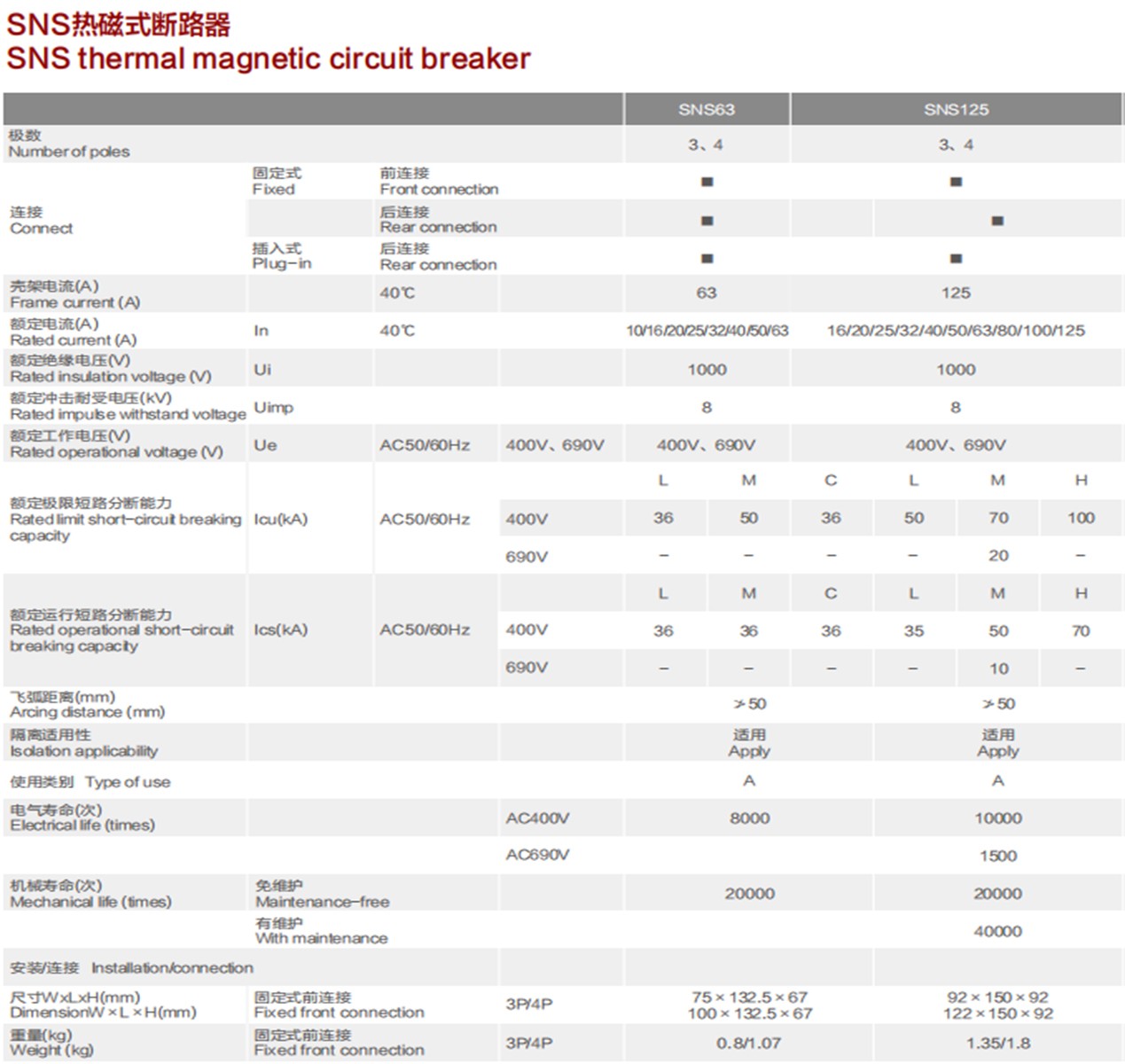 SNS熱磁式斷路器具有過載、短路和欠壓保護(hù)功能,能保護(hù)線路和電源設(shè)備不受損壞。有63型、125型、250型、400型、630型、800型六個(gè)殼架,電流從16A~800A。