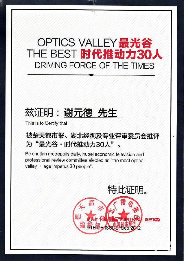 我公司董事長榮獲2012“最光谷?時代推動力30人”稱號