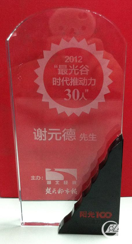 9月20日晚,第2012“最光谷?時代推動力30人”頒獎盛典在光谷湯遜湖畔陽光100大湖隆重舉行。該活動由楚天都市報、湖北經濟電視臺聯合陽光100置業集團主辦。自7月份啟動后,經過先后三輪的嚴格篩選,最終評出了30位“最光谷?時代推動力”人物,我公司謝元德董事長成功當選。