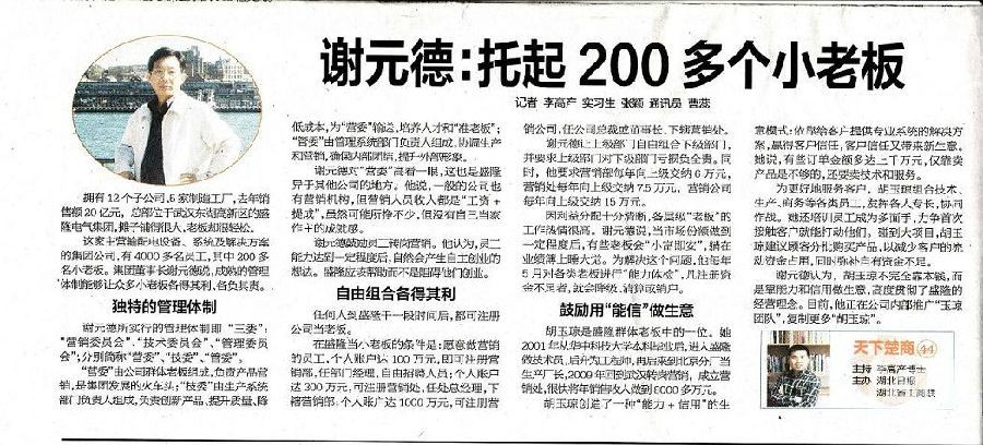 因利益分配十分清晰,各層級“老板”的工作熱情很高。謝元德說,當市場份額做到一定程度后,有些老板會“小富即安”,躺在業績簿上睡大覺。為解決這個問題,他每年5月對各類老板進行“能力體檢”,凡注冊資金不足者,就會降級、清算或銷戶。