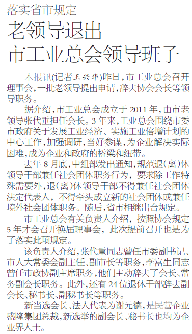 昨日,市工業總會召開理事會,一批老領導提出申請,辭去協會會長等領導職務。