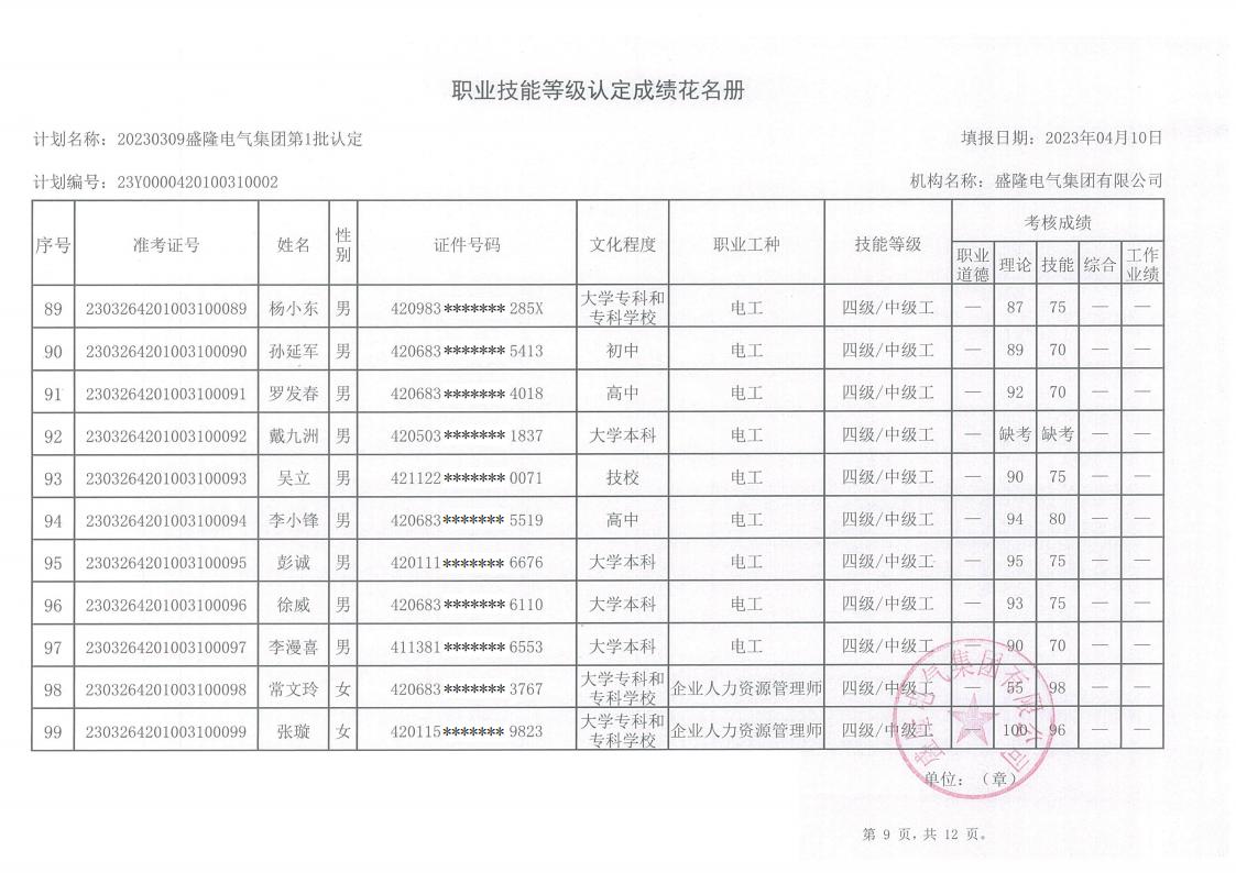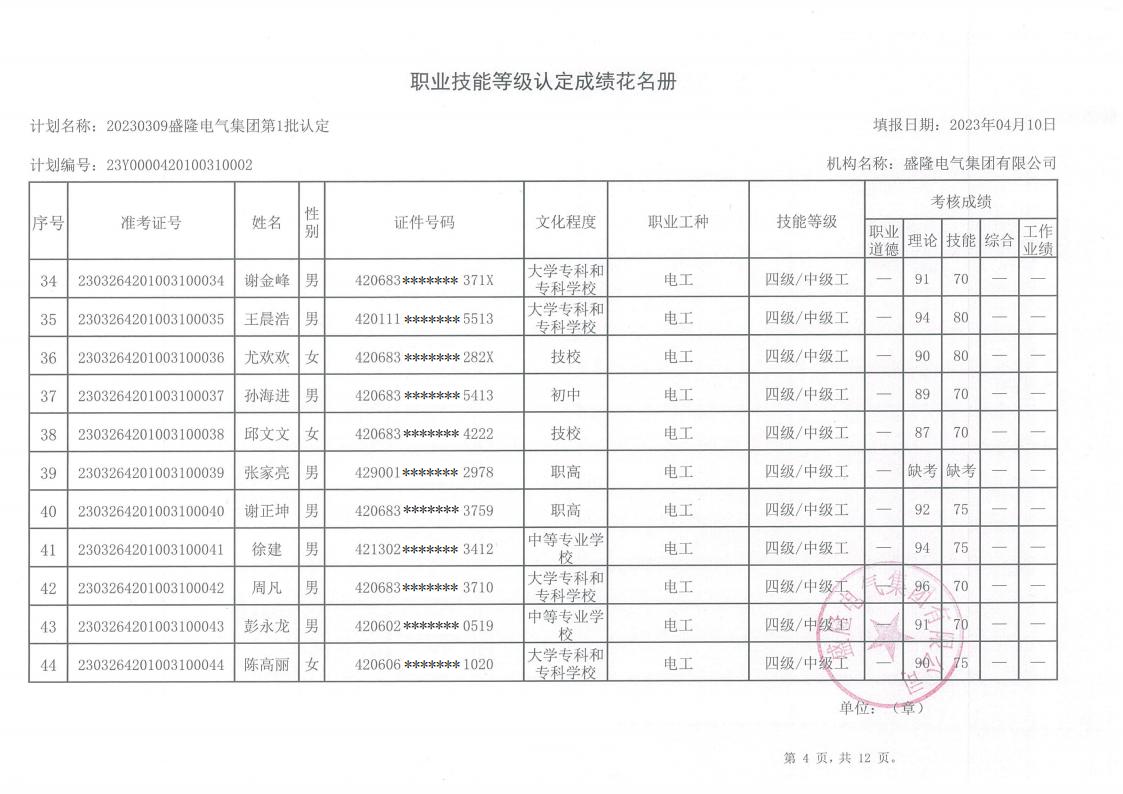根據湖北省人力資源和社會保障廳《湖北省職業技能等級認定工作實施細則》(【2020】45號)文件的有關規定,現將盛隆電氣集團2023年第三批職業技能等級認定——電工(四級)、企業人力資源管理師(四級)成績予以公示,詳情見附件。