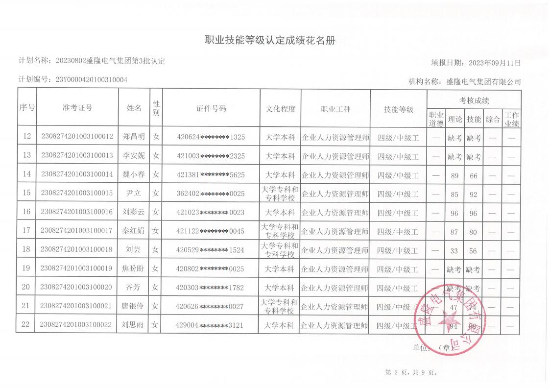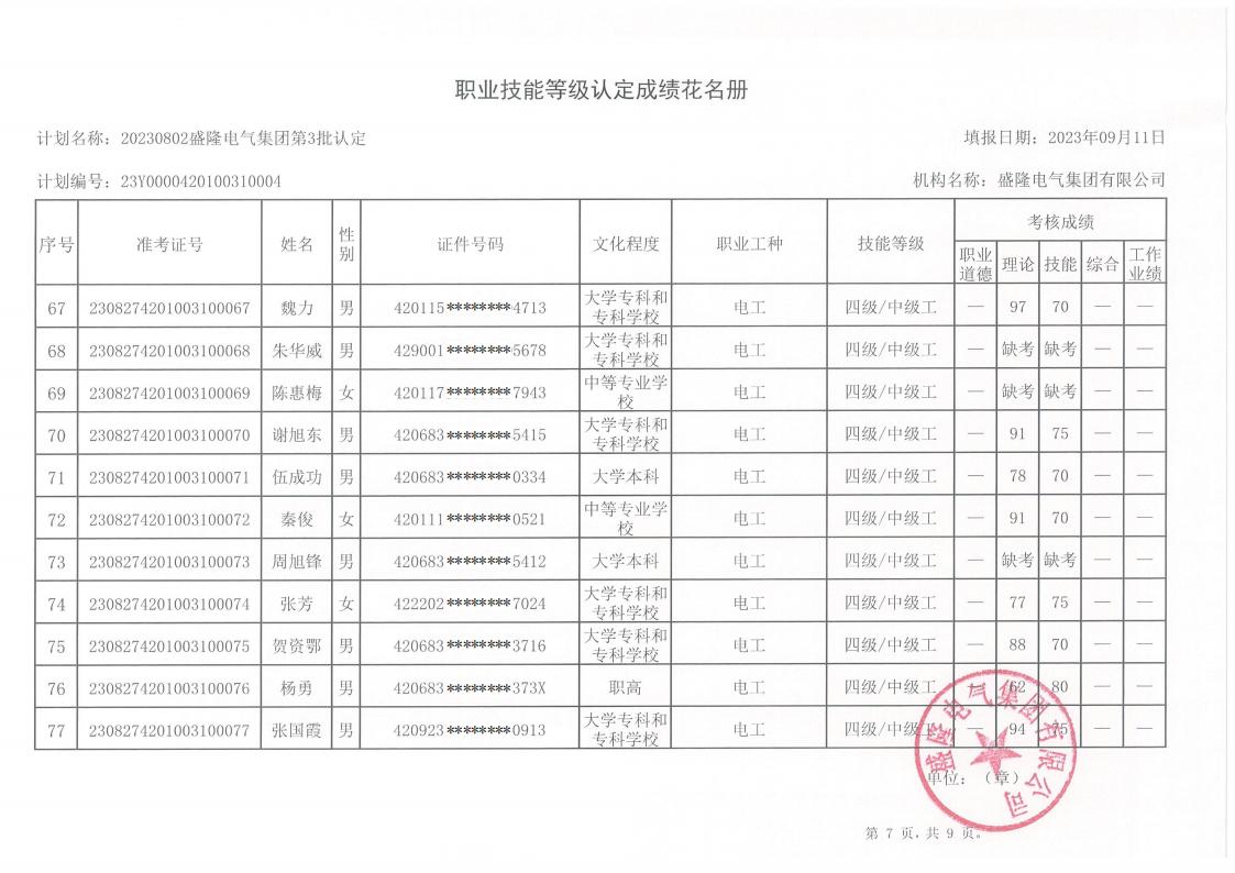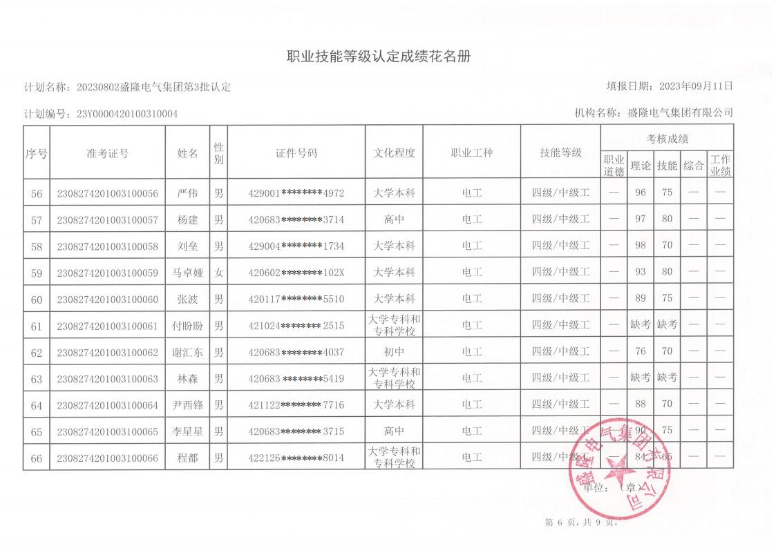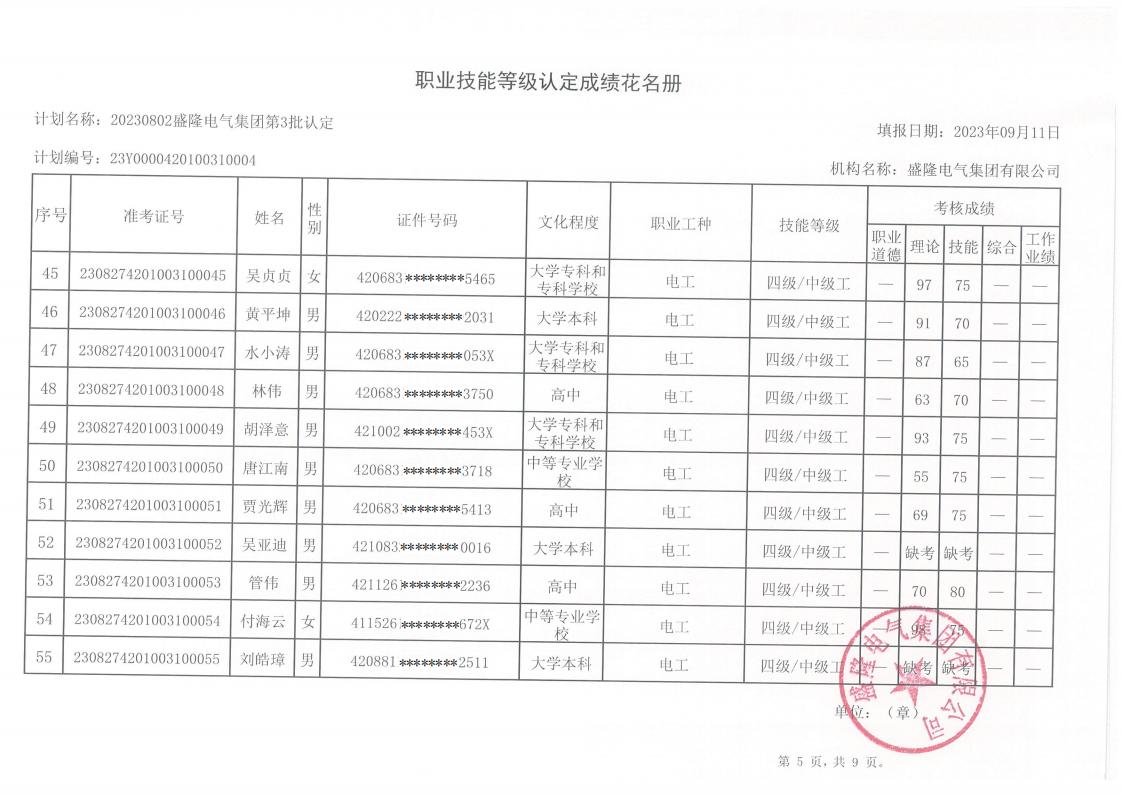 關于盛隆電氣第五批職業技能等級認定成績的公示