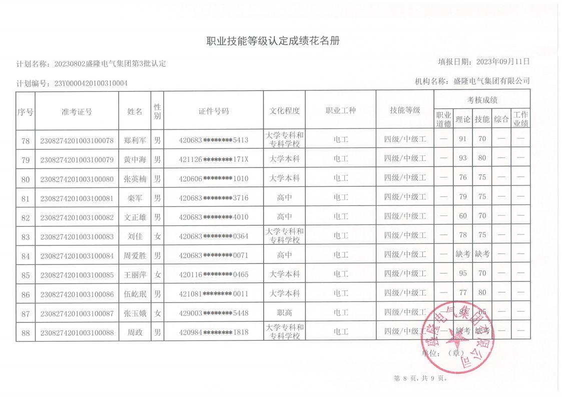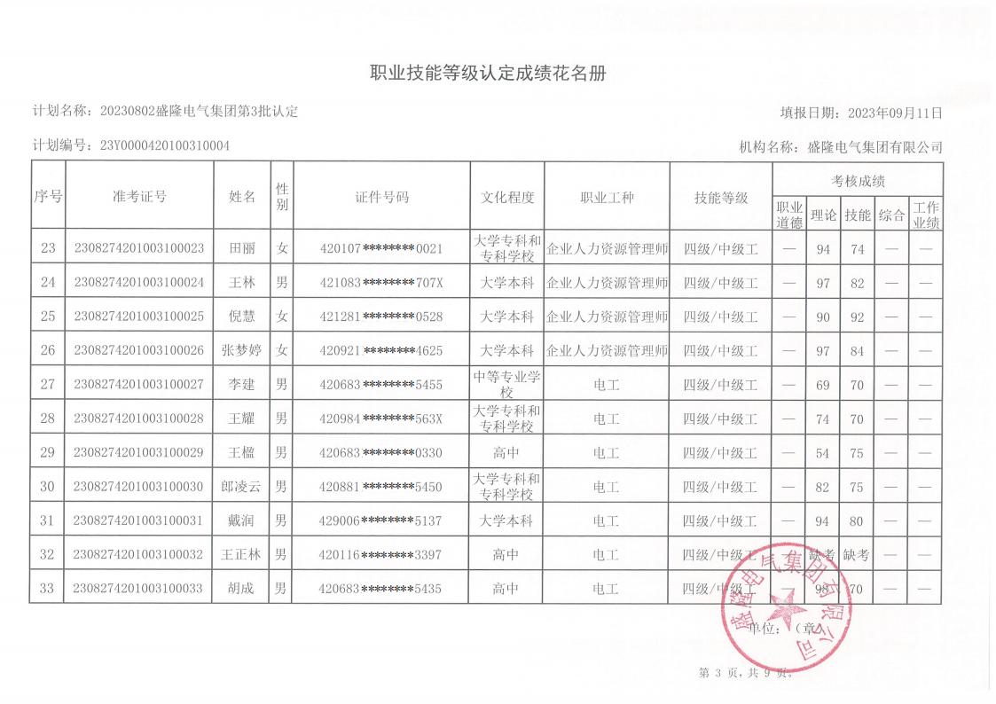 根據湖北省人力資源和社會保障廳《湖北省職業技能等級認定工作實施細則》(【2020】45號)文件的有關規定,現將盛隆電氣集團2023年第五批職業技能等級認定——電工(四級)、企業人力資源管理師(四級)成績予以公示,詳情見附件。