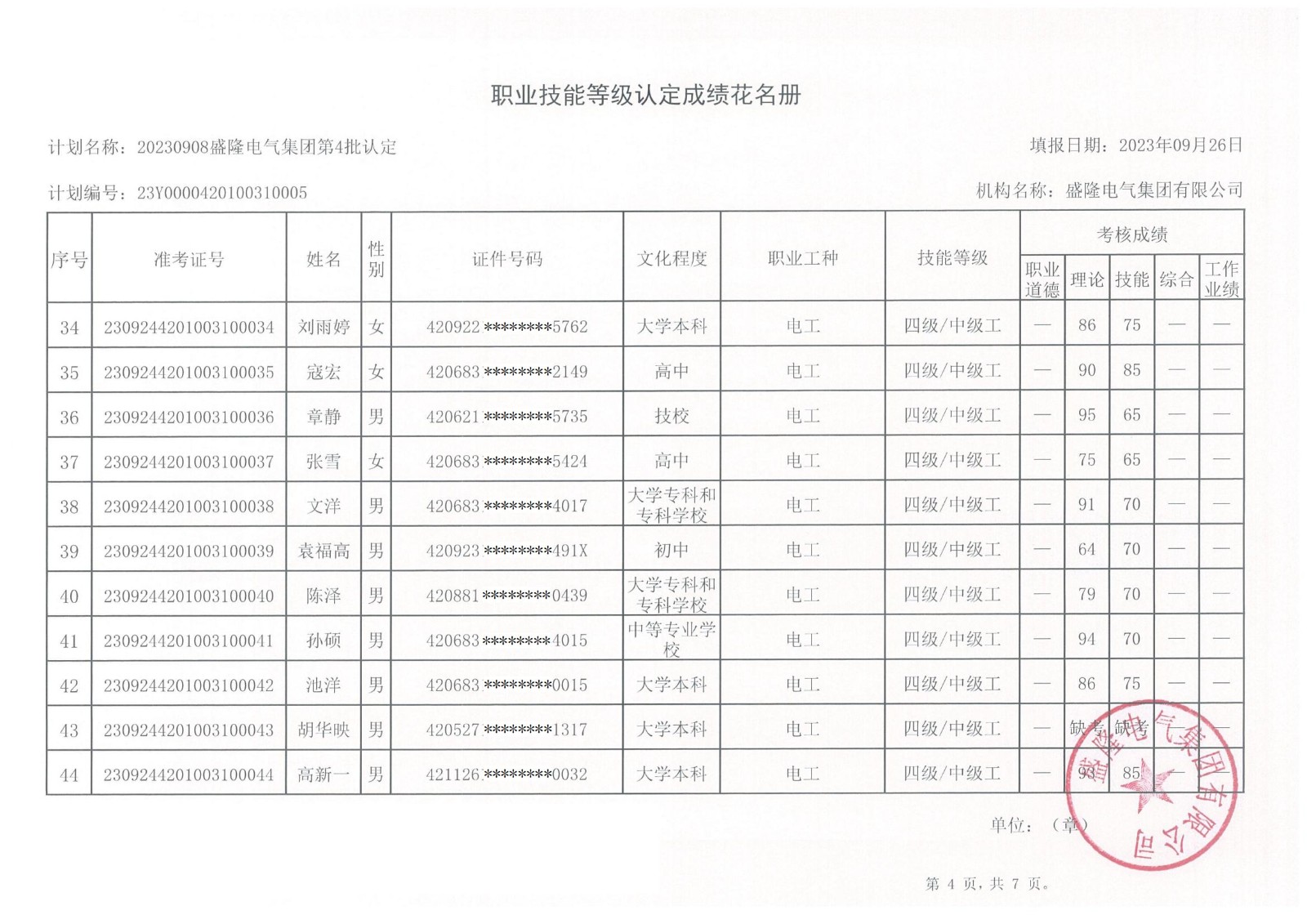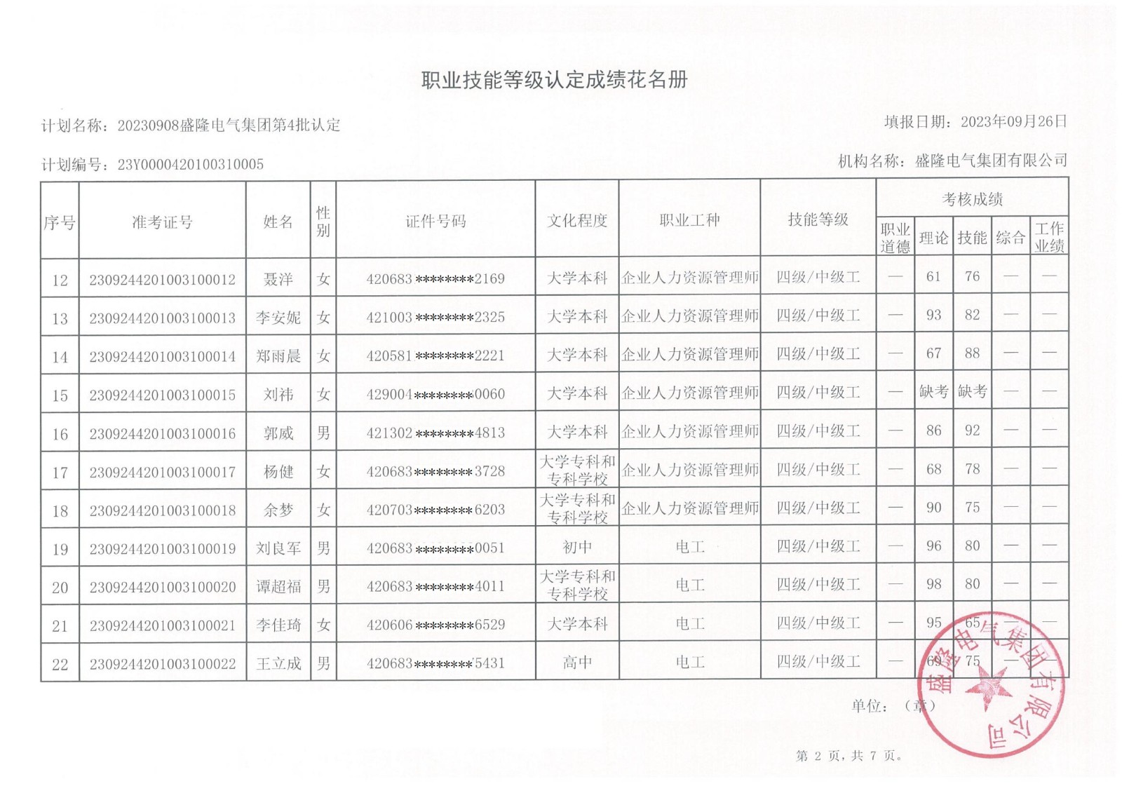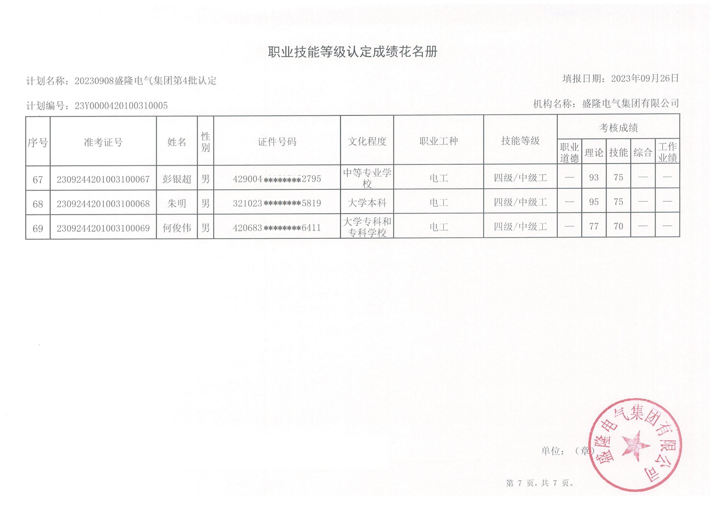根據(jù)湖北省人力資源和社會保障廳《湖北省職業(yè)技能等級認定工作實施細則》(【2020】45號)文件的有關規(guī)定,現(xiàn)將盛隆電氣集團2023年第六批職業(yè)技能等級認定——電工(四級)、企業(yè)人力資源管理師(四級)成績予以公示,詳情見附件。