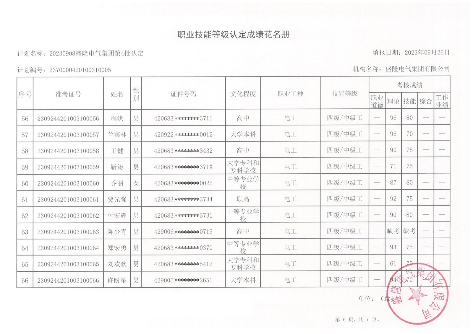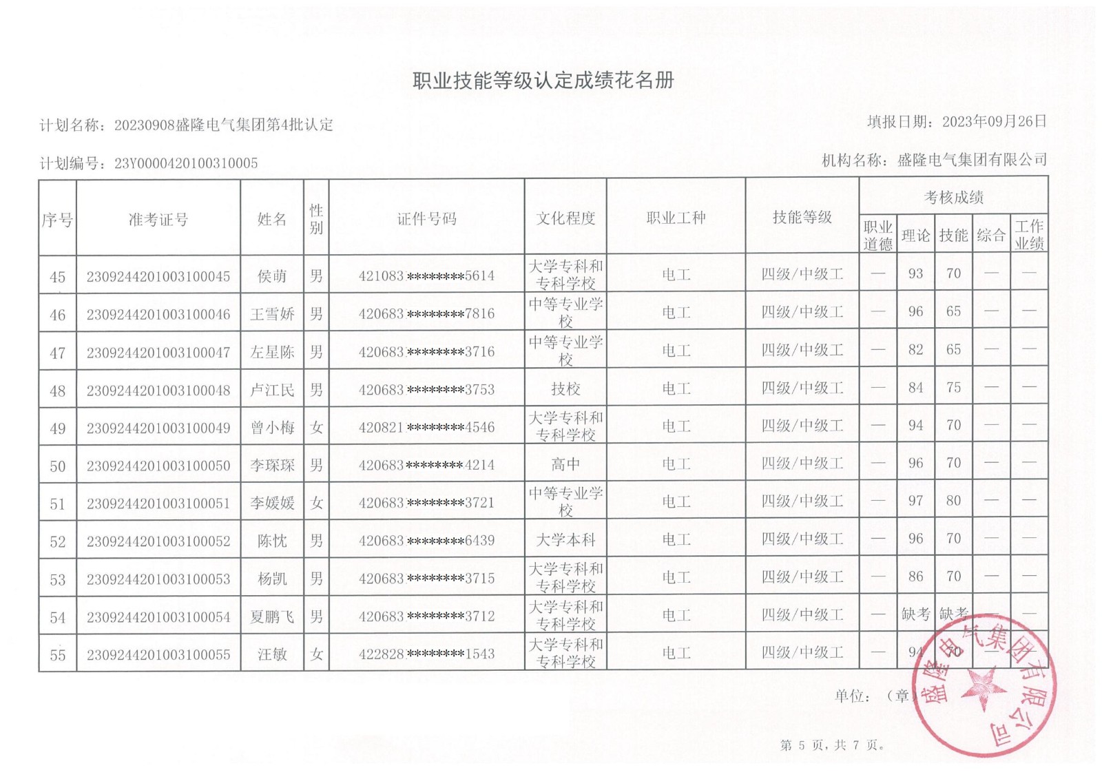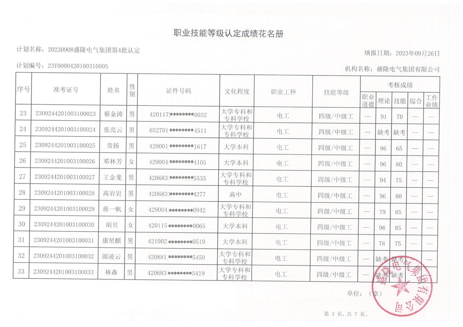 根據(jù)湖北省人力資源和社會保障廳《湖北省職業(yè)技能等級認定工作實施細則》(【2020】45號)文件的有關規(guī)定,現(xiàn)將盛隆電氣集團2023年第六批職業(yè)技能等級認定——電工(四級)、企業(yè)人力資源管理師(四級)成績予以公示,詳情見附件。