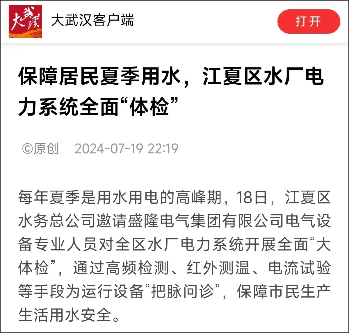 【轉(zhuǎn)自長江日報】盛隆電氣為江夏區(qū)水廠做電力“體檢”,保障居民夏季“用水無憂”