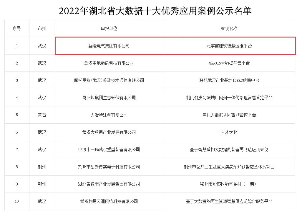 盛隆電氣元宇宙建筑智慧運維平臺獲評“2022年湖北省大數據十大優秀應用案例”